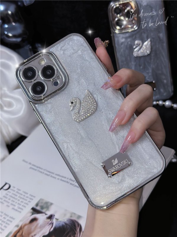 スワロフスキー風のiPhoneケースです。SWAROVSKIのメタルロゴとアイコンであるスワンのモチーフをあしらい、上品な輝きを放ちます。持っているだけで華やかな気分を味わえる珍しいデザイン♪2色展開でお友達とおそろいも可愛い!